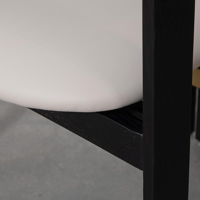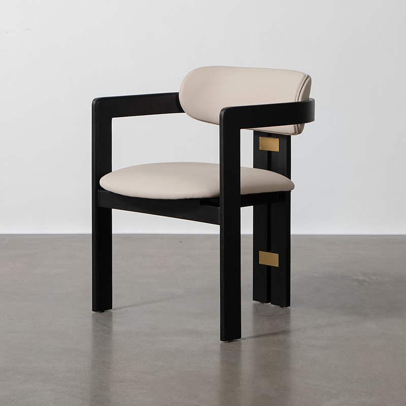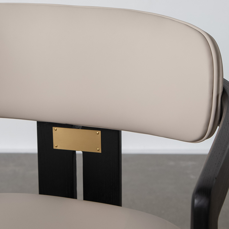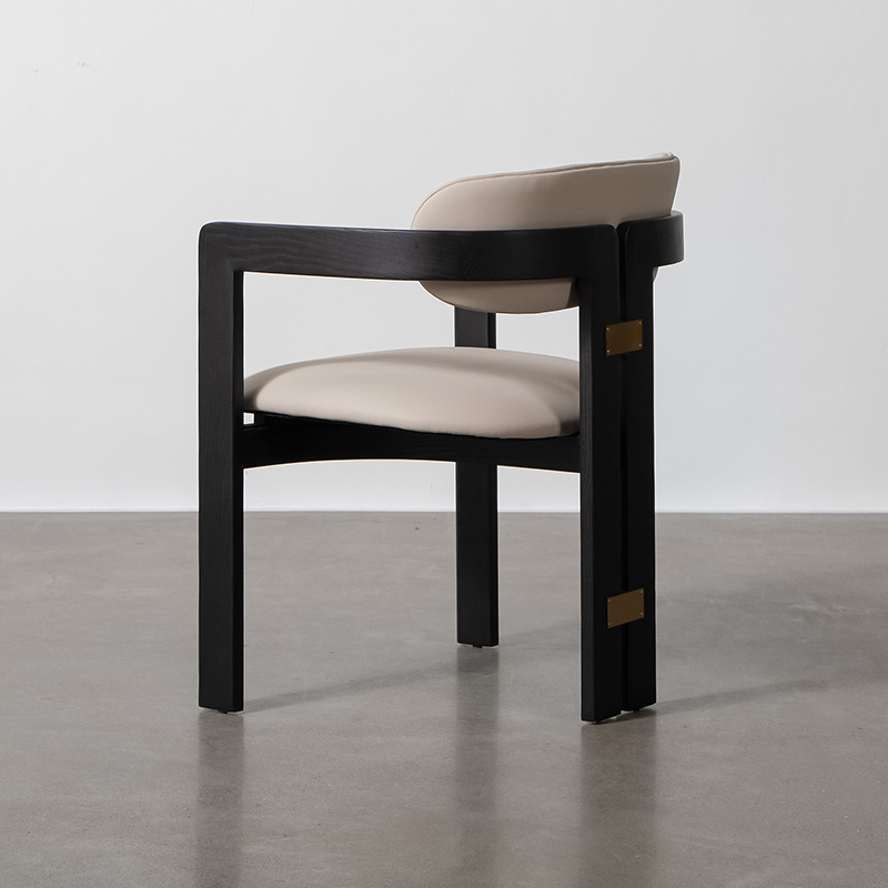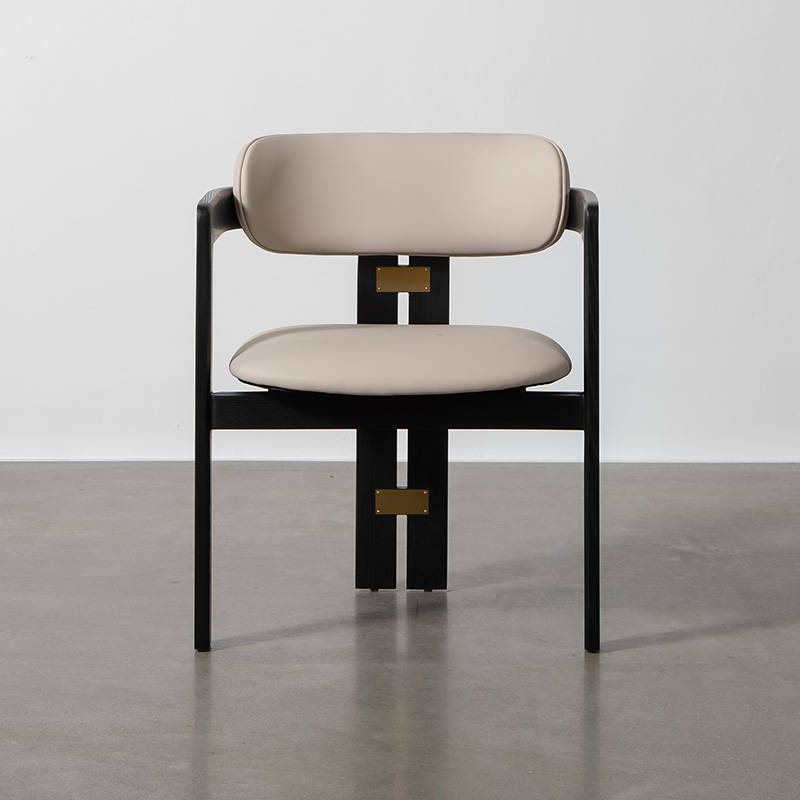 Prachtig dynamisch frame, beginnend bij de voorpoot die doorloopt in de armleuningen en eindigt in de achterpoot. Messing metalen elementen aan de achterkant van de Replica Pamplona-stoel van stof en hout benadrukken de strakke en moderne uitstraling van de stoelen.